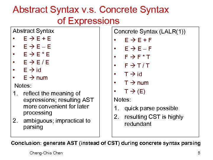 Expr Plus. Expr e 1 e 2 Num. Expr : 5 Expr Plus : + Term Bin. Expr op: plus e 1 e 2 Num. Expr : 2 Factor Number : 5 Num. Expr : 5 Number: 2 Possible ASTs for ‘ 2+5’ Cheng-Chia Chen The parse tree for ‘ 2+5’ 4