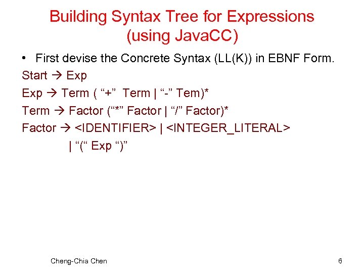 Building Syntax Tree for Expressions (using Java. CC) • First devise the Concrete Syntax (LL(K)) in EBNF Form. Start Exp Term ( “+” Term | “-” Tem)* Term Factor (“*” Factor | “/” Factor)* Factor <IDENTIFIER> | <INTEGER_LITERAL> | “(“ Exp “)” Cheng-Chia Chen 6