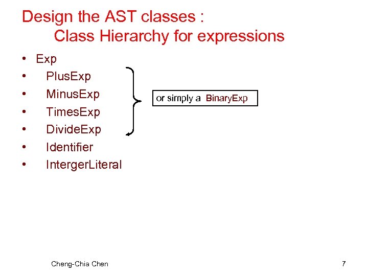 Design the AST classes : Class Hierarchy for expressions • • Exp Plus. Exp Minus. Exp Times. Exp Divide. Exp Identifier Interger. Literal Cheng-Chia Chen or simply a Binary. Exp 7