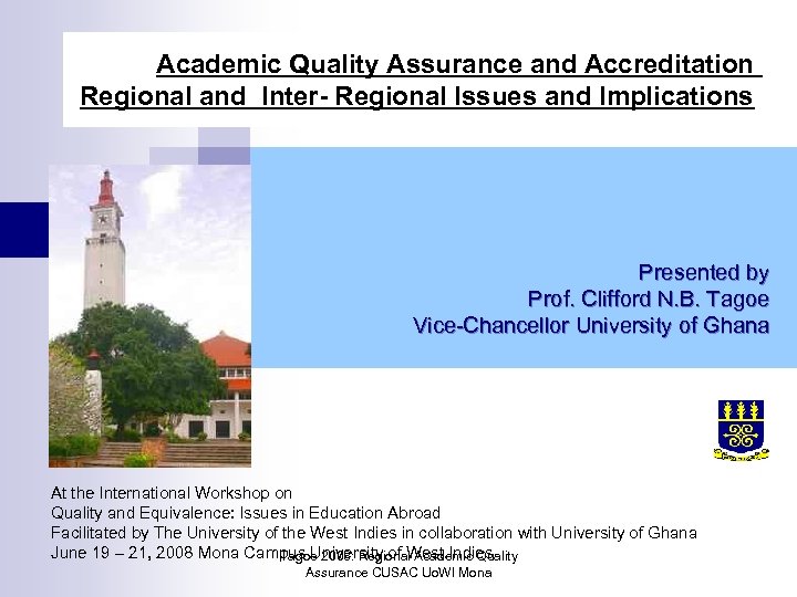 Academic Quality Assurance and Accreditation Regional and Inter- Regional Issues and Implications Presented by Prof. Clifford N. B. Tagoe Vice-Chancellor University of Ghana At the International Workshop on Quality and Equivalence: Issues in Education Abroad Facilitated by The University of the West Indies in collaboration with University of Ghana June 19 – 21, 2008 Mona Campus University of West Indies Tagoe 2008: Regional Academic Quality Assurance CUSAC Uo. WI Mona