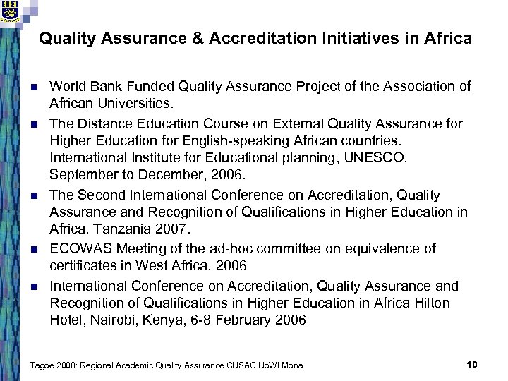 Weaknesses and Threats in Quality Assurance n n n Lack of Institutional Capacity Lack of Human Capacity Lack of Funds Poor Inter-University Communication Private versus Public institutional conflict Government Interference Tagoe 2008: Regional Academic Quality Assurance CUSAC Uo. WI Mona 9