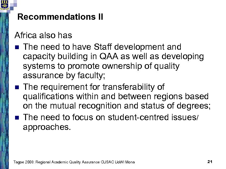 Recommendations I For Africa to achieve credible QAA for its universities we need to address: n n n The need to have clarity of purpose, terminology and regulations; The requirement to have transparency at all levels, contributing to delivering trust by creating macro level understanding and due diligence procedures in developing partnerships; The need for coherence in the practice of regulatory bodies and independent bodies to assure the quality of QA agencies (Quis custodiet ipsos custodes? ); Tagoe 2008: Regional Academic Quality Assurance CUSAC Uo. WI Mona 20