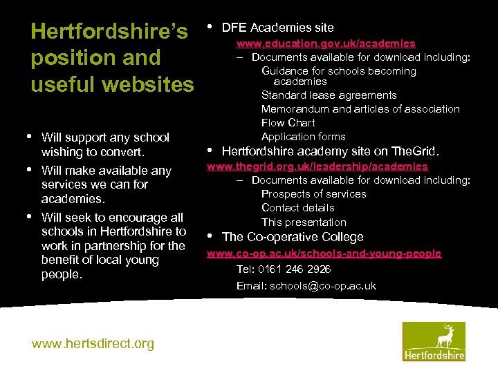Hertfordshire’s position and useful websites • • • Will support any school wishing to convert. Will make available any services we can for academies. Will seek to encourage all schools in Hertfordshire to work in partnership for the benefit of local young people. www. hertsdirect. org • • DFE Academies site www. education. gov. uk/academies – Documents available for download including: Guidance for schools becoming academies Standard lease agreements Memorandum and articles of association Flow Chart Application forms Hertfordshire academy site on The. Grid. www. thegrid. org. uk/leadership/academies – Documents available for download including: Prospects of services Contact details This presentation • The Co-operative College www. co-op. ac. uk/schools-and-young-people Tel: 0161 246 2926 Email: schools@co-op. ac. uk