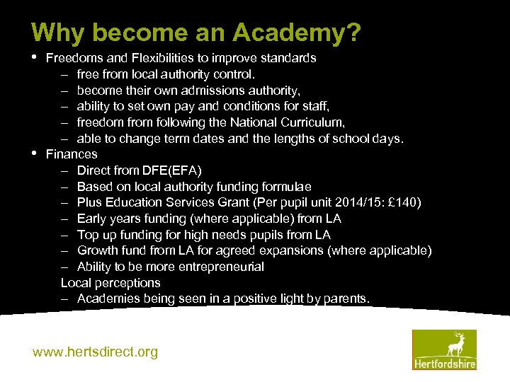 Why become an Academy? • • Freedoms and Flexibilities to improve standards – free from local authority control. – become their own admissions authority, – ability to set own pay and conditions for staff, – freedom from following the National Curriculum, – able to change term dates and the lengths of school days. Finances – Direct from DFE(EFA) – Based on local authority funding formulae – Plus Education Services Grant (Per pupil unit 2014/15: £ 140) – Early years funding (where applicable) from LA – Top up funding for high needs pupils from LA – Growth fund from LA for agreed expansions (where applicable) – Ability to be more entrepreneurial Local perceptions – Academies being seen in a positive light by parents. www. hertsdirect. org
