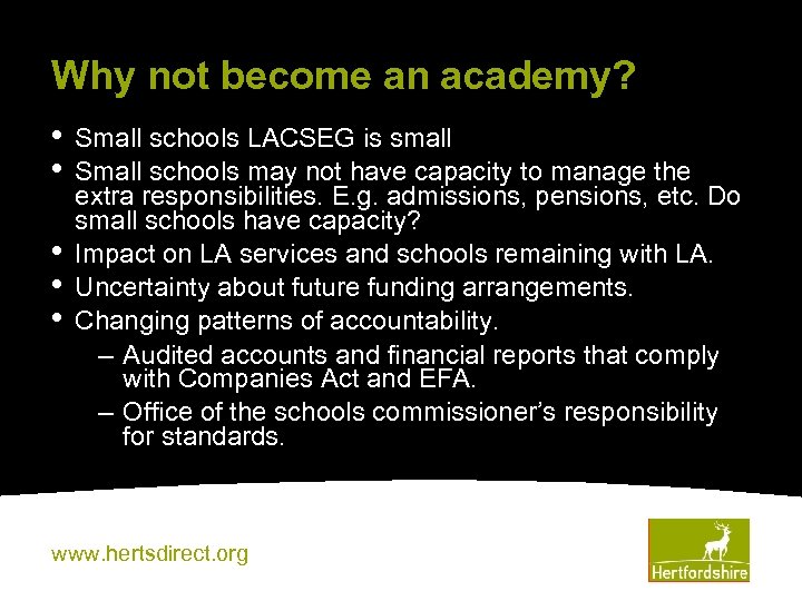Why not become an academy? • • • Small schools LACSEG is small Small schools may not have capacity to manage the extra responsibilities. E. g. admissions, pensions, etc. Do small schools have capacity? Impact on LA services and schools remaining with LA. Uncertainty about future funding arrangements. Changing patterns of accountability. – Audited accounts and financial reports that comply with Companies Act and EFA. – Office of the schools commissioner’s responsibility for standards. www. hertsdirect. org