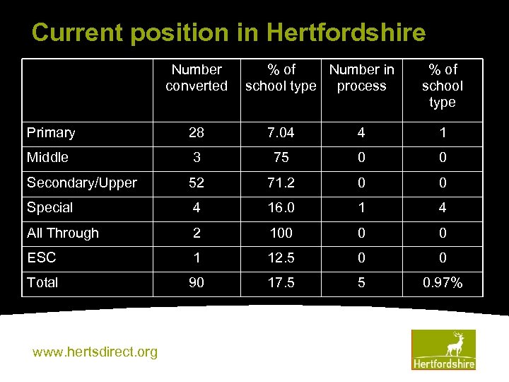 Current position in Hertfordshire Number converted % of Number in school type process % of school type Primary 28 7. 04 4 1 Middle 3 75 0 0 Secondary/Upper 52 71. 2 0 0 Special 4 16. 0 1 4 All Through 2 100 0 0 ESC 1 12. 5 0 0 Total 90 17. 5 5 0. 97% www. hertsdirect. org
