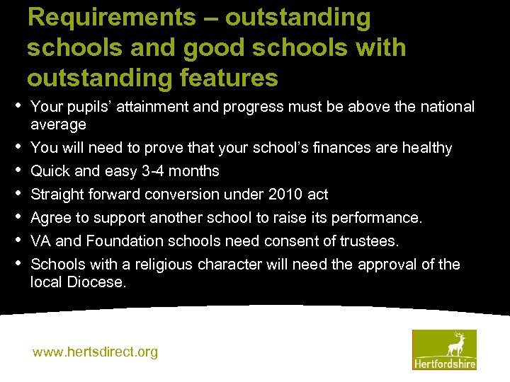 Requirements – outstanding schools and good schools with outstanding features • • Your pupils’ attainment and progress must be above the national average You will need to prove that your school’s finances are healthy Quick and easy 3 -4 months Straight forward conversion under 2010 act Agree to support another school to raise its performance. VA and Foundation schools need consent of trustees. Schools with a religious character will need the approval of the local Diocese. www. hertsdirect. org