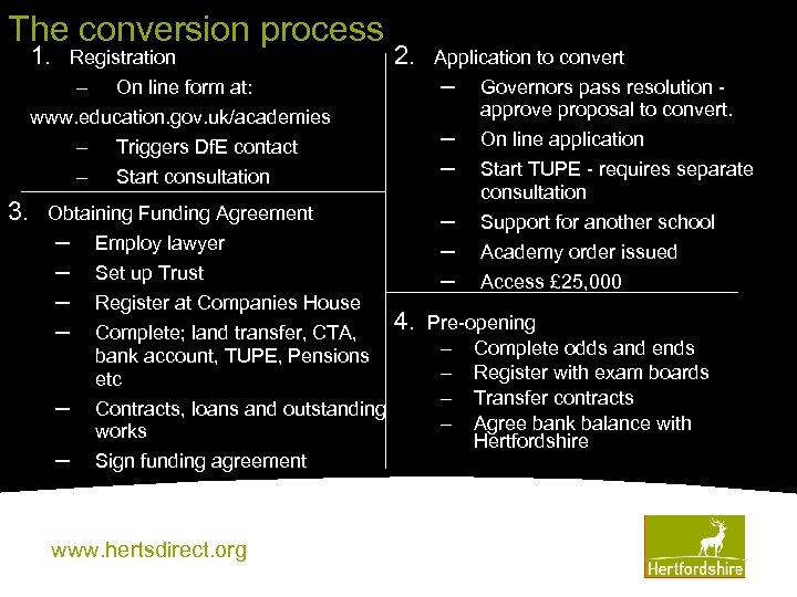 The conversion process 1. Registration – On line form at: 2. www. education. gov. uk/academies – Triggers Df. E contact – Start consultation 3. – – Obtaining Funding Agreement – Employ lawyer – – – Set up Trust Register at Companies House Complete; land transfer, CTA, bank account, TUPE, Pensions etc Contracts, loans and outstanding works Sign funding agreement www. hertsdirect. org Application to convert – Governors pass resolution approve proposal to convert. – – – 4. On line application Start TUPE - requires separate consultation Support for another school Academy order issued Access £ 25, 000 Pre-opening – Complete odds and ends – Register with exam boards – Transfer contracts – Agree bank balance with Hertfordshire