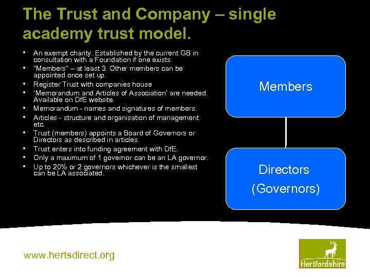The Trust and Company – single academy trust model. • • • An exempt charity. Established by the current GB in consultation with a Foundation if one exists. “Members” – at least 3. Other members can be appointed once set up. Register Trust with companies house ‘Memorandum and Articles of Association’ are needed. Available on Df. E website. Memorandum - names and signatures of members. Articles - structure and organisation of management etc. Trust (members) appoints a Board of Governors or Directors as described in articles. Trust enters into funding agreement with Df. E. Only a maximum of 1 governor can be an LA governor. Up to 20% or 2 governors whichever is the smallest can be LA associated. www. hertsdirect. org Members Directors (Governors)