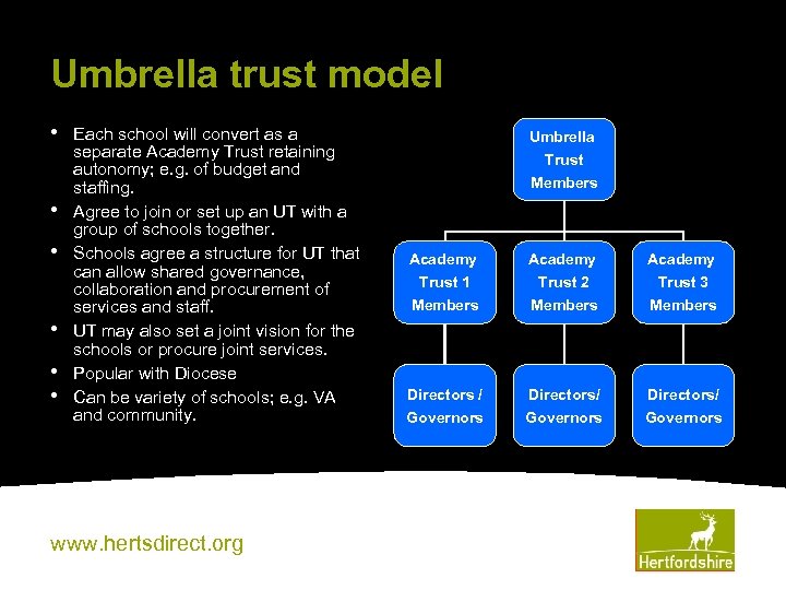 Umbrella trust model • • • Each school will convert as a separate Academy Trust retaining autonomy; e. g. of budget and staffing. Agree to join or set up an UT with a group of schools together. Schools agree a structure for UT that can allow shared governance, collaboration and procurement of services and staff. UT may also set a joint vision for the schools or procure joint services. Popular with Diocese Can be variety of schools; e. g. VA and community. www. hertsdirect. org Umbrella Trust Members Academy Trust 1 Academy Trust 2 Academy Trust 3 Members Directors / Governors Directors/ Governors