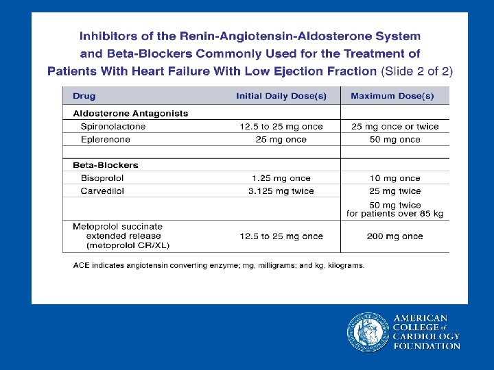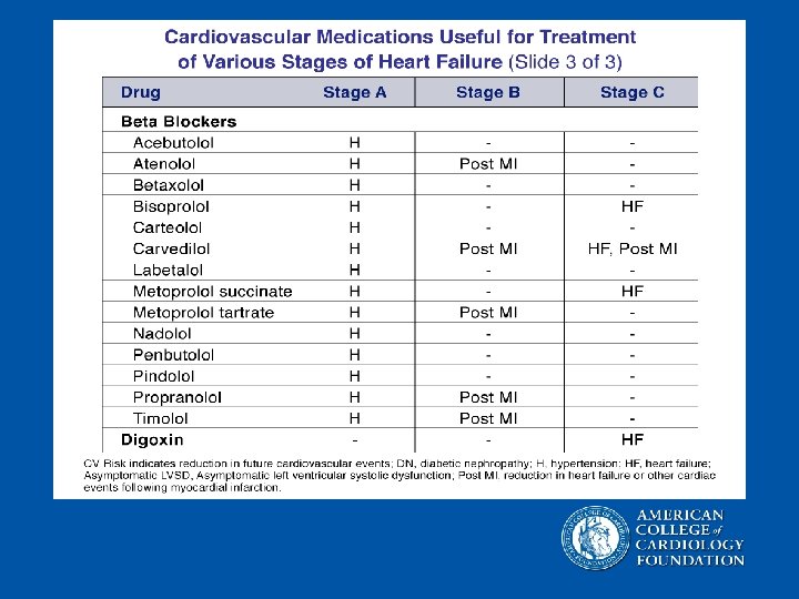 Стадия С: Терапия (Сниженная ФВ + симптомы) Бета-блокаторы ВАБ ( только 3: bisoprolol, carvedilol, metoprolol succinate) показаны у всех пациентов, если нет противопоказаний