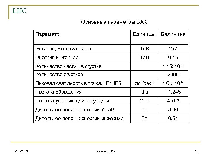 LHC Основные параметры БАК Параметр Единицы Величина Энергия, максимальная Тэ. В 2 х7 Энергия инжекции Тэ. В 0. 45 Количество частиц в сгустке 1. 15 х1011 Количество сгустков 2808 Пиковая светимость в точках IP 1 IP 5 1. 0 х 1034 Частота обращения к. Гц 11. 245 Частота ускоряющей структуры МГц 400. 8 Дипольное поле на энергии 7 Тэ. В Тл 8. 36 Дипольное поле на энергии инжекции 3/19/2018 см-2 сек-1 Тл 0. 54 (слайдов: 43) 13