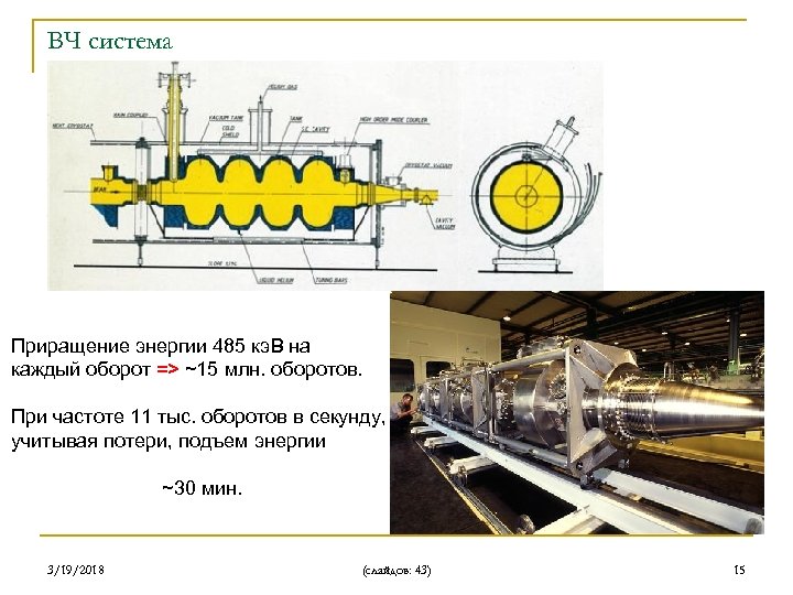 ВЧ система Сверхпроводящие резонаторы Приращение энергии 485 кэ. В на каждый оборот => ~15 млн. оборотов. При частоте 11 тыс. оборотов в секунду, учитывая потери, подъем энергии ~30 мин. 3/19/2018 (слайдов: 43) 15
