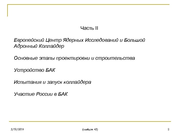 Часть II Европейский Центр Ядерных Исследований и Большой Адронный Коллайдер Основные этапы проектировки и строительства Устройство БАК Испытания и запуск коллайдера Участие России в БАК 3/19/2018 (слайдов: 43) 2