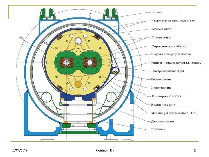 Магнитная система Основные дипольные магниты Параметры: Рабочий ток до 11, 8 к. А Рабочее поле до 8. 33 Тл Длина магнита: 15 м Количество в одном секторе (одной цепи): 154 шт. ! Запасенная энергия в одной цепи: 1. 1 ГДж ! 3/19/2018 (слайдов: 43) 19