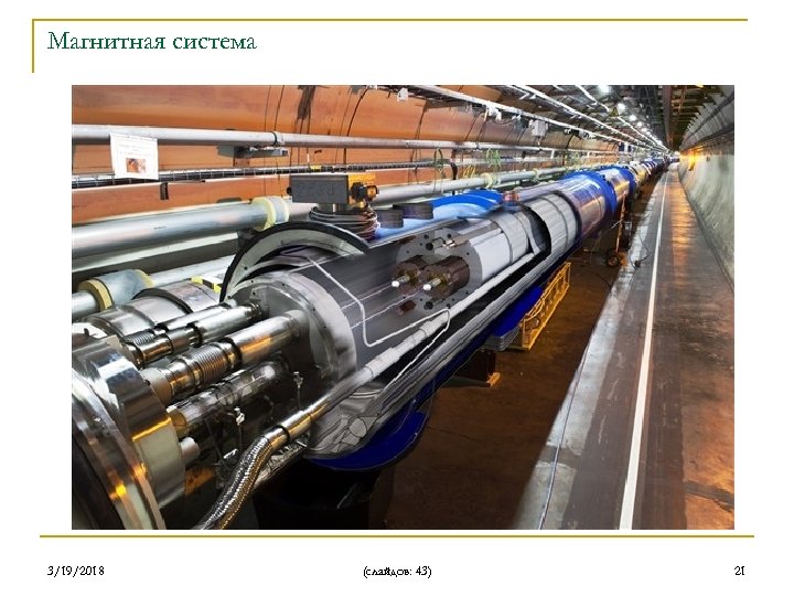 Магнитная система Типы магнитов Рабочая Макс. ток температура, К Кол-во магнитов Основные диполи 1. 9 13 k. A 1232 Основные квадруполи 1. 9 13 k. A 392 Индивидуально запитываемые квадруполи 4. 5 4 – 6 k. A 110 Разделительные диполи 4. 5 6 k. A 18 Квадруполи финальной фокусировки 1. 9 11 k. A 32 Корректирующие магниты 1. 9 60 - 600 A > 4000 3/19/2018 (слайдов: 43) 17