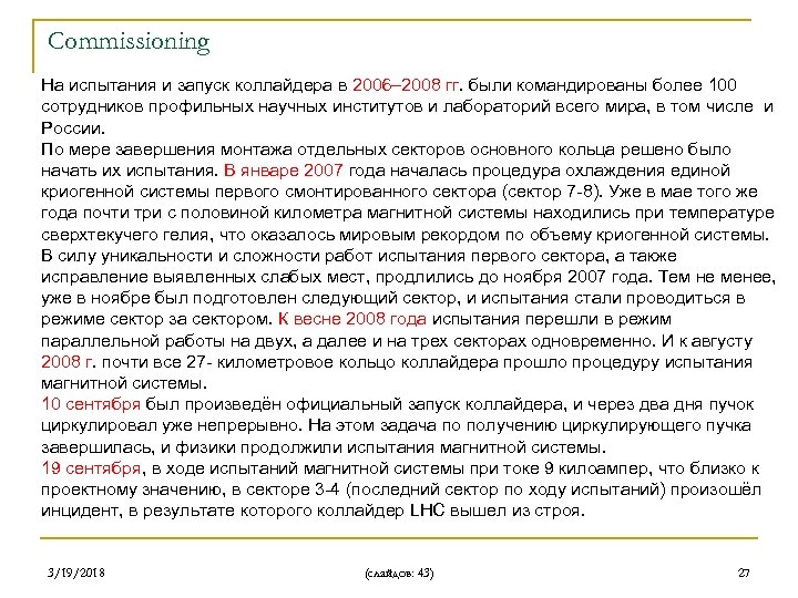 Commissioning На испытания и запуск коллайдера в 2006– 2008 гг. были командированы более 100 сотрудников профильных научных институтов и лабораторий всего мира, в том числе и России. По мере завершения монтажа отдельных секторов основного кольца решено было начать их испытания. В январе 2007 года началась процедура охлаждения единой криогенной системы первого смонтированного сектора (сектор 7 -8). Уже в мае того же года почти три с половиной километра магнитной системы находились при температуре сверхтекучего гелия, что оказалось мировым рекордом по объему криогенной системы. В силу уникальности и сложности работ испытания первого сектора, а также исправление выявленных слабых мест, продлились до ноября 2007 года. Тем не менее, уже в ноябре был подготовлен следующий сектор, и испытания стали проводиться в режиме сектор за сектором. К весне 2008 года испытания перешли в режим параллельной работы на двух, а далее и на трех секторах одновременно. И к августу 2008 г. почти все 27 - километровое кольцо коллайдера прошло процедуру испытания магнитной системы. 10 сентября был произведён официальный запуск коллайдера, и через два дня пучок циркулировал уже непрерывно. На этом задача по получению циркулирующего пучка завершилась, и физики продолжили испытания магнитной системы. 19 сентября, в ходе испытаний магнитной системы при токе 9 килоампер, что близко к проектному значению, в секторе 3 -4 (последний сектор по ходу испытаний) произошёл инцидент, в результате которого коллайдер LHC вышел из строя. 3/19/2018 (слайдов: 43) 27