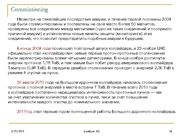Commissioning Несмотря на тяжелейшие последствия аварии, в течение первой половины 2009 года были отремонтированы и поставлены на свое место более 50 магнитов, проверены все соединения между магнитами (одно их таких соединений и послужило причиной аварии) и установлены новые каналы защиты (мониторинга) этих соединений, что позволит предотвратить подобные аварии в будущем. К концу 2009 года произошел повторный запуск коллайдера, а 23 ноября LHC официально стал «коллайдером» : самые первые протон-протонные столкновения были зарегистрированы всеми четырьмя детекторами. В конце ноября достигнута энергия протонов 1, 18 Тэ. В, и тем самым был побит рекорд американского коллайдера Тэватрон (0, 98 Тэ. В). В середине декабря столкновения проходят с энергией 2, 36 Тэ. В в режиме 4 сгустка на пучок. 30 марта 2010 года на Большом адронном коллайдере начались столкновения протонов с полной энергией в месте встречи 7 Тэ. В. В течение всего 2010 года в коллайдере постепенно наращивалась интенсивность протонных пучков — как за счет увеличения количества сгустков в пучке, так и за счет повышения интенсивности каждого сгустка до номинального значения. 2011 год стал первым годом полноценной работы Большого адронного коллайдера. 3/19/2018 (слайдов: 43) 28
