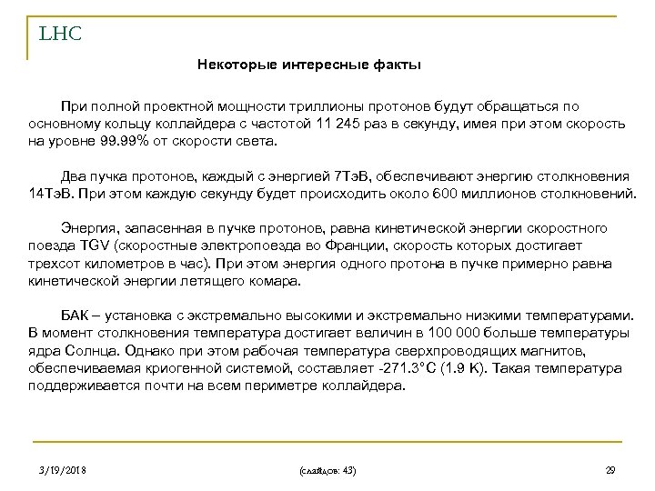 LHC Некоторые интересные факты При полной проектной мощности триллионы протонов будут обращаться по основному кольцу коллайдера с частотой 11 245 раз в секунду, имея при этом скорость на уровне 99. 99% от скорости света. Два пучка протонов, каждый с энергией 7 Тэ. В, обеспечивают энергию столкновения 14 Тэ. В. При этом каждую секунду будет происходить около 600 миллионов столкновений. Энергия, запасенная в пучке протонов, равна кинетической энергии скоростного поезда TGV (скоростные электропоезда во Франции, скорость которых достигает трехсот километров в час). При этом энергия одного протона в пучке примерно равна кинетической энергии летящего комара. БАК – установка с экстремально высокими и экстремально низкими температурами. В момент столкновения температура достигает величин в 100 000 больше температуры ядра Солнца. Однако при этом рабочая температура сверхпроводящих магнитов, обеспечиваемая криогенной системой, составляет -271. 3°C (1. 9 K). Такая температура поддерживается почти на всем периметре коллайдера. 3/19/2018 (слайдов: 43) 29