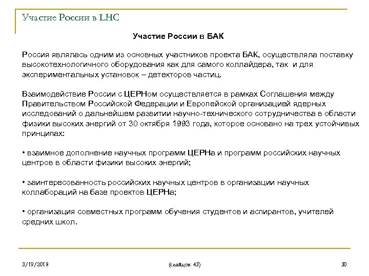 Участие России в LHC Участие России в БАК Россия являлась одним из основных участников проекта БАК, осуществляла поставку высокотехнологичного оборудования как для самого коллайдера, так и для экспериментальных установок – детекторов частиц. Взаимодействие России с ЦЕРНом осуществляется в рамках Соглашения между Правительством Российской Федерации и Европейской организацией ядерных исследований о дальнейшем развитии научно-технического сотрудничества в области физики высоких энергий от 30 октября 1993 года, которое основано на трех устойчивых принципах: • взаимное дополнение научных программ ЦЕРНа и программ российских научных центров в области физики высоких энергий; • заинтересованность российских научных центров в организации научных коллабораций на базе проектов ЦЕРНа; • организация совместных программ обучения студентов и аспирантов, учителей средних школ. 3/19/2018 (слайдов: 43) 30