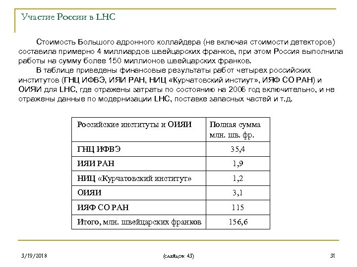 Участие России в LHC Стоимость Большого адронного коллайдера (не включая стоимости детекторов) составила примерно 4 миллиардов швейцарских франков, при этом Россия выполнила работы на сумму более 150 миллионов швейцарских франков. В таблице приведены финансовые результаты работ четырех российских институтов (ГНЦ ИФВЭ, ИЯИ РАН, НИЦ «Курчатовский инстиут» , ИЯФ СО РАН) и ОИЯИ для LHC, где отражены затраты по состоянию на 2006 год включительно, и не отражены данные по модернизации LHC, поставке запасных частей и т. д. Российские институты и ОИЯИ Полная сумма млн. шв. фр. ГНЦ ИФВЭ 35, 4 ИЯИ РАН 1, 9 НИЦ «Курчатовский институт» 1, 2 ОИЯИ 3, 1 ИЯФ СО РАН 115 Итого, млн. швейцарских франков 3/19/2018 (слайдов: 43) 156, 6 31
