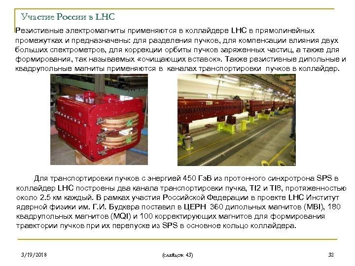 Участие России в LHC Резистивные электромагниты применяются в коллайдере LHC в прямолинейных промежутках и предназначены: для разделения пучков, для компенсации влияния двух больших спектрометров, для коррекции орбиты пучков заряженных частиц, а также для формирования, так называемых «очищающих вставок» . Также резистивные дипольные и квадрупольные магниты применяются в каналах транспортировки пучков в коллайдер. Для транспортировки пучков с энергией 450 Гэ. В из протонного синхротрона SPS в коллайдер LHC построены два канала транспортировки пучка, ТI 2 и TI 8, протяженностью около 2. 5 км каждый. В рамках участия Российской Федерации в проекте LHC Институт ядерной физики им. Г. И. Будкера поставил в ЦЕРН 360 дипольных магнитов (MBI), 180 квадрупольных магнитов (MQI) и 100 корректирующих магнитов для формирования траектории пучков при их перепуске из SPS в основное кольцо коллайдера. 3/19/2018 (слайдов: 43) 32