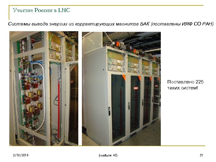 Участие России в LHC Энергия, запасенная во всей магнитной системе, составляет порядка 10 ГДж (более 1 ГДж в одном секторе), а максимальный ток варьируется от сотен ампер в цепи корректирующих магнитов до 13 к. А в цепи основных магнитов. Большинство сверхпроводящих магнитов коллайдера LHC требуют защиты в случае перехода проводника в резистивное состояние (срыв сверхпроводимости). При этом основным элементом защиты является система вывода энергии из сверхпроводящих магнитов. Системы вывода энергии из основных магнитов БАК (поставлены ИФВЭ и ИЯФ СО РАН) 3/19/2018 (слайдов: 43) 36
