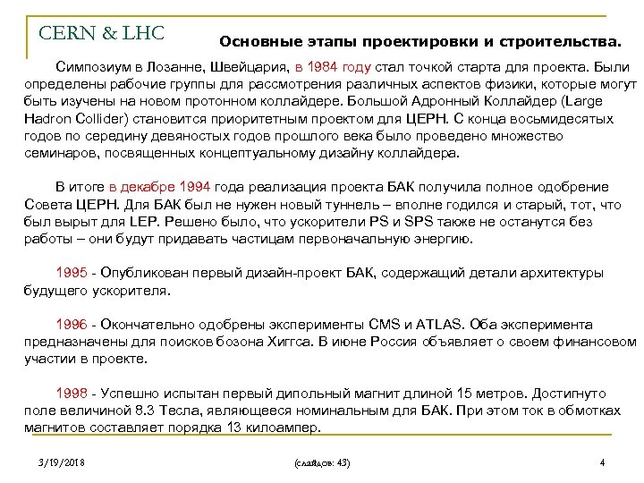 LHC Европейский Центр Ядерных Исследований и Большой Адронный Коллайдер В начале 1980 -х годов был предложен проект ускорителя, осуществляющего столкновения электронов и их антиподов – позитронов, – большой электрон -позитронный коллайдер (LEP). Осенью 1983 года началось строительство LEP. В долине Женевского озера на глубине ста метров был вырыт кольцевой туннель общей длиной 27 километров. Качество подземных работ было столь высоким, что, когда в 1988 году два конца туннеля соединились, расхождение между ними составило всего один сантиметр. 3/19/2018 (слайдов: 43) 3