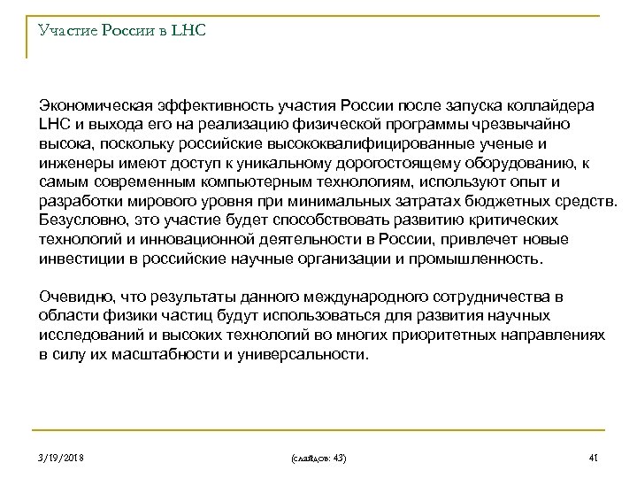 Участие России в LHC Экономическая эффективность участия России после запуска коллайдера LHC и выхода его на реализацию физической программы чрезвычайно высока, поскольку российские высококвалифицированные ученые и инженеры имеют доступ к уникальному дорогостоящему оборудованию, к самым современным компьютерным технологиям, используют опыт и разработки мирового уровня при минимальных затратах бюджетных средств. Безусловно, это участие будет способствовать развитию критических технологий и инновационной деятельности в России, привлечет новые инвестиции в российские научные организации и промышленность. Очевидно, что результаты данного международного сотрудничества в области физики частиц будут использоваться для развития научных исследований и высоких технологий во многих приоритетных направлениях в силу их масштабности и универсальности. 3/19/2018 (слайдов: 43) 41