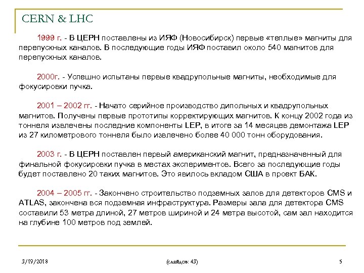 CERN & LHC Основные этапы проектировки и строительства. Симпозиум в Лозанне, Швейцария, в 1984 году стал точкой старта для проекта. Были определены рабочие группы для рассмотрения различных аспектов физики, которые могут быть изучены на новом протонном коллайдере. Большой Адронный Коллайдер (Large Hadron Collider) становится приоритетным проектом для ЦЕРН. С конца восьмидесятых годов по середину девяностых годов прошлого века было проведено множество семинаров, посвященных концептуальному дизайну коллайдера. В итоге в декабре 1994 года реализация проекта БАК получила полное одобрение Совета ЦЕРН. Для БАК был не нужен новый туннель – вполне годился и старый, тот, что был вырыт для LEP. Решено было, что ускорители PS и SPS также не останутся без работы – они будут придавать частицам первоначальную энергию. 1995 - Опубликован первый дизайн-проект БАК, содержащий детали архитектуры будущего ускорителя. 1996 - Окончательно одобрены эксперименты CMS и ATLAS. Оба эксперимента предназначены для поисков бозона Хиггса. В июне Россия объявляет о своем финансовом участии в проекте. 1998 - Успешно испытан первый дипольный магнит длиной 15 метров. Достигнуто поле величиной 8. 3 Тесла, являющееся номинальным для БАК. При этом ток в обмотках магнитов составляет порядка 13 килоампер. 3/19/2018 (слайдов: 43) 4