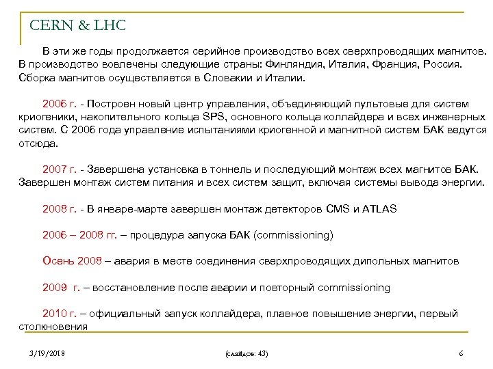 CERN & LHC 1999 г. - В ЦЕРН поставлены из ИЯФ (Новосибирск) первые «теплые» магниты для перепускных каналов. В последующие годы ИЯФ поставил около 540 магнитов для перепускных каналов. 2000 г. - Успешно испытаны первые квадрупольные магниты, необходимые для фокусировки пучка. 2001 – 2002 гг. - Начато серийное производство дипольных и квадрупольных магнитов. Получены первые прототипы корректирующих магнитов. К концу 2002 года из тоннеля извлечены последние компоненты LEP, в итоге за 14 месяцев демонтажа LEP из 27 километрового тоннеля было извлечено более 40 000 тонн оборудования. 2003 г. - В ЦЕРН поставлен первый американский магнит, предназначенный для финальной фокусировки пучка в местах экспериментов. Всего за последующие годы будет поставлено 20 таких магнитов. Это явилось вкладом США в проект БАК. 2004 – 2005 гг. - Закончено строительство подземных залов для детекторов CMS и ATLAS, закончена вся подземная инфраструктура. Размеры зала для детектора CMS составили 53 метра длиной, 27 метров шириной и 24 метра высотой, сам зал находится на глубине 100 метров под землей. 3/19/2018 (слайдов: 43) 5