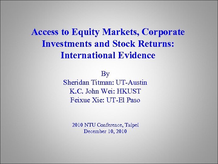 Access to Equity Markets, Corporate Investments and Stock Returns: International Evidence By Sheridan Titman: UT-Austin K. C. John Wei: HKUST Feixue Xie: UT-El Paso 2010 NTU Conference, Taipei December 10, 2010