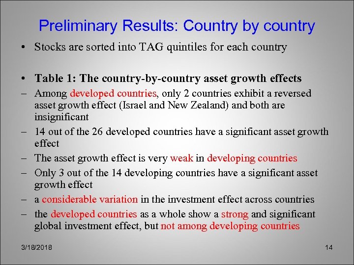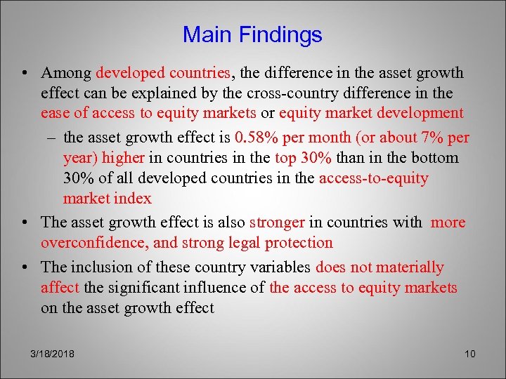Main Findings • Among developed countries, the difference in the asset growth effect can be explained by the cross-country difference in the ease of access to equity markets or equity market development – the asset growth effect is 0. 58% per month (or about 7% per year) higher in countries in the top 30% than in the bottom 30% of all developed countries in the access-to-equity market index • The asset growth effect is also stronger in countries with more overconfidence, and strong legal protection • The inclusion of these country variables does not materially affect the significant influence of the access to equity markets on the asset growth effect 3/18/2018 10