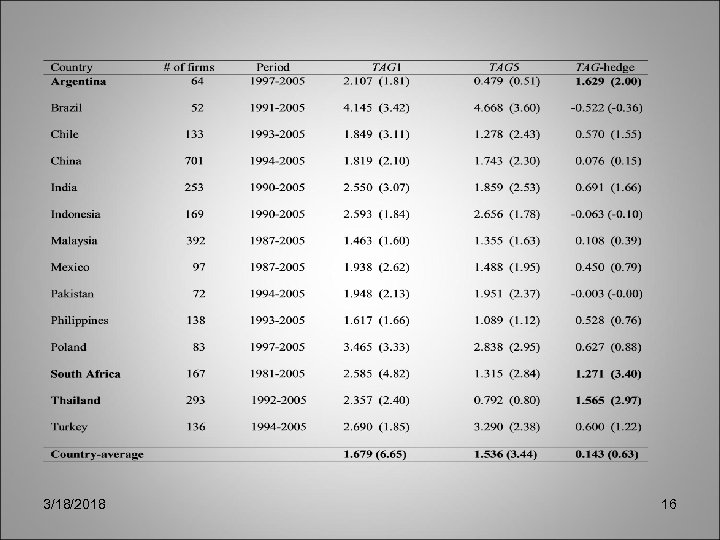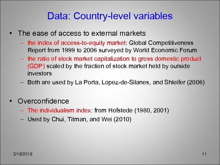 Data: Country-level variables • The ease of access to external markets – the index of access-to-equity market: Global Competitiveness Report from 1999 to 2006 surveyed by World Economic Forum – the ratio of stock market capitalization to gross domestic product (GDP) scaled by the fraction of stock market held by outside investors – Both are used by La Porta, Lopez-de-Silanes, and Shleifer (2006) • Overconfidence – The individualism index: from Hofstede (1980, 2001) – Used by Chui, Titman, and Wei (2010) 3/18/2018 11