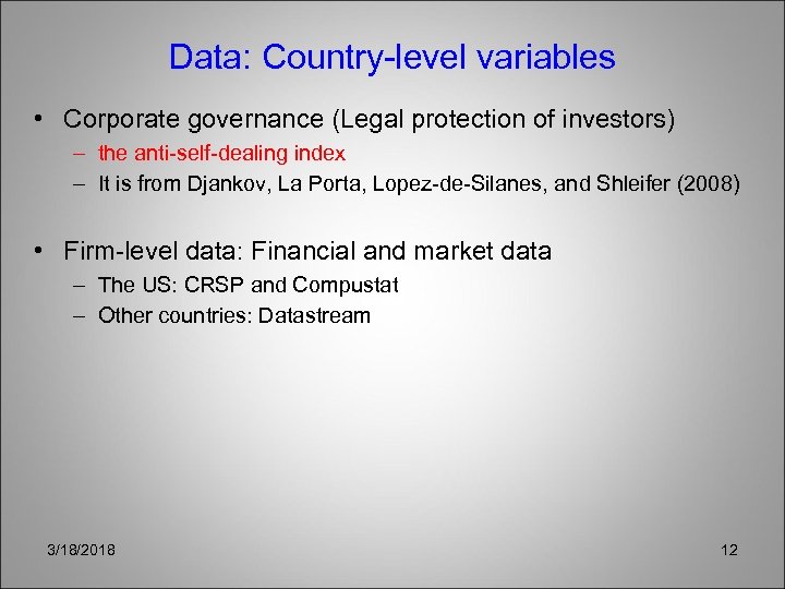 Data: Country-level variables • Corporate governance (Legal protection of investors) – the anti-self-dealing index – It is from Djankov, La Porta, Lopez-de-Silanes, and Shleifer (2008) • Firm-level data: Financial and market data – The US: CRSP and Compustat – Other countries: Datastream 3/18/2018 12
