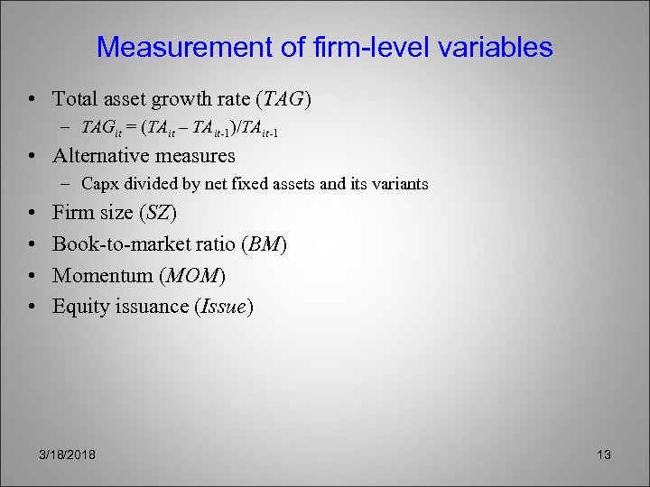 Measurement of firm-level variables • Total asset growth rate (TAG) – TAGit = (TAit – TAit-1)/TAit-1 • Alternative measures – Capx divided by net fixed assets and its variants • • Firm size (SZ) Book-to-market ratio (BM) Momentum (MOM) Equity issuance (Issue) 3/18/2018 13