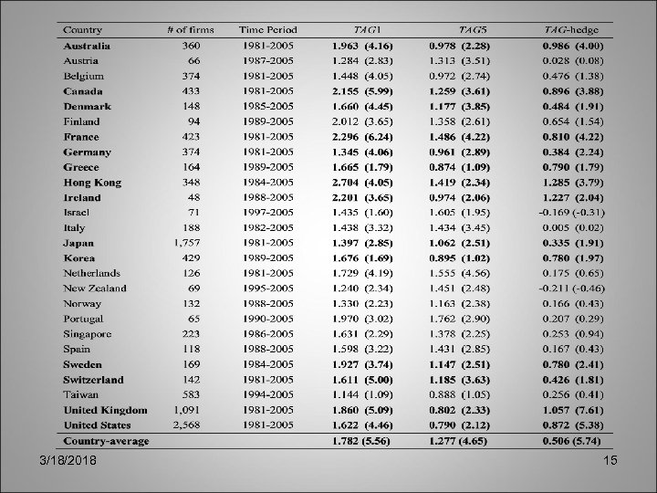 Preliminary Results: Country by country • Stocks are sorted into TAG quintiles for each country • Table 1: The country-by-country asset growth effects – Among developed countries, only 2 countries exhibit a reversed asset growth effect (Israel and New Zealand) and both are insignificant – 14 out of the 26 developed countries have a significant asset growth effect – The asset growth effect is very weak in developing countries – Only 3 out of the 14 developing countries have a significant asset growth effect – a considerable variation in the investment effect across countries – the developed countries as a whole show a strong and significant global investment effect, but not among developing countries 3/18/2018 14