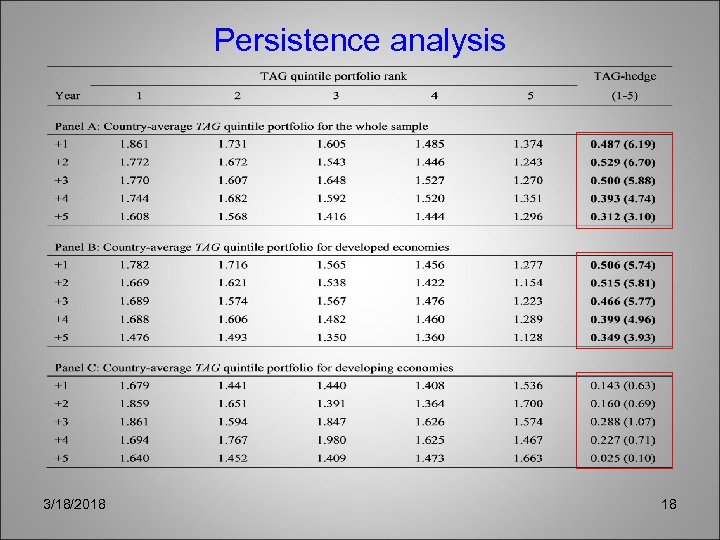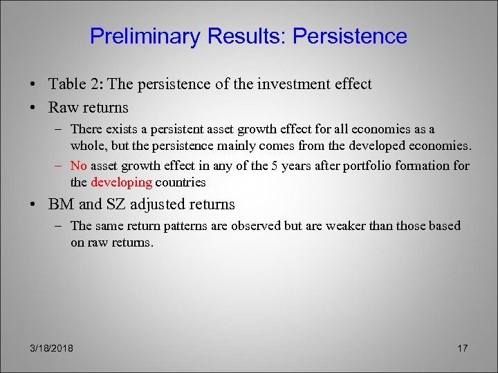 Preliminary Results: Persistence • Table 2: The persistence of the investment effect • Raw returns – There exists a persistent asset growth effect for all economies as a whole, but the persistence mainly comes from the developed economies. – No asset growth effect in any of the 5 years after portfolio formation for the developing countries • BM and SZ adjusted returns – The same return patterns are observed but are weaker than those based on raw returns. 3/18/2018 17