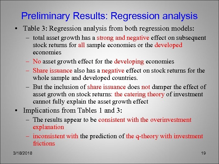 Preliminary Results: Regression analysis • Table 3: Regression analysis from both regression models: – total asset growth has a strong and negative effect on subsequent stock returns for all sample economies or the developed economies – No asset growth effect for the developing economies – Share issuance also has a negative effect on stock returns for the whole sample and developed countries. – But the inclusion of share issuance does not damper the effect of asset growth on stock returns: the catering theory of investment cannot fully explain the asset growth effect • Implications from Tables 1 and 3: – The results appear to be consistent with the overinvestment explanation – inconsistent with the prediction of the q-theory with investment frictions 3/18/2018 19