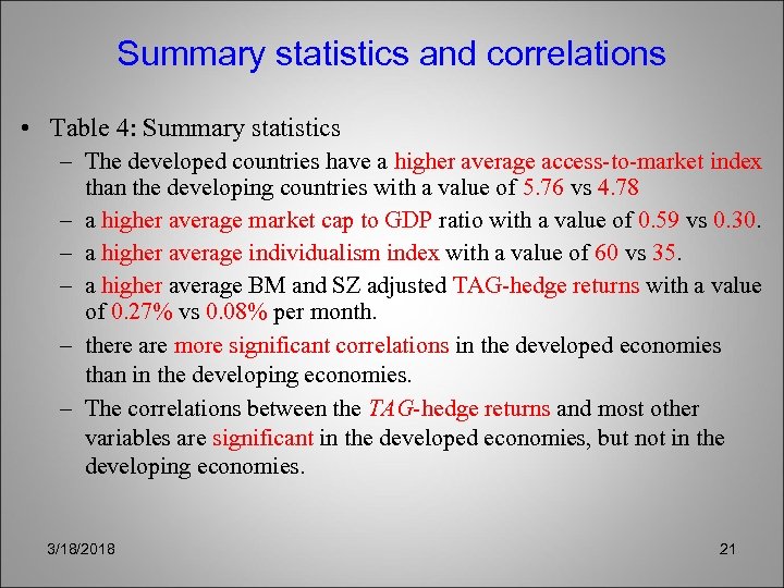 Summary statistics and correlations • Table 4: Summary statistics – The developed countries have a higher average access-to-market index than the developing countries with a value of 5. 76 vs 4. 78 – a higher average market cap to GDP ratio with a value of 0. 59 vs 0. 30. – a higher average individualism index with a value of 60 vs 35. – a higher average BM and SZ adjusted TAG-hedge returns with a value of 0. 27% vs 0. 08% per month. – there are more significant correlations in the developed economies than in the developing economies. – The correlations between the TAG-hedge returns and most other variables are significant in the developed economies, but not in the developing economies. 3/18/2018 21