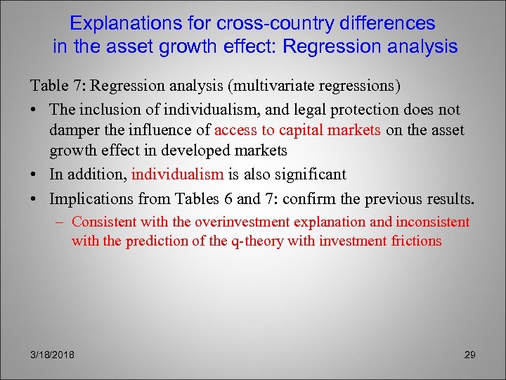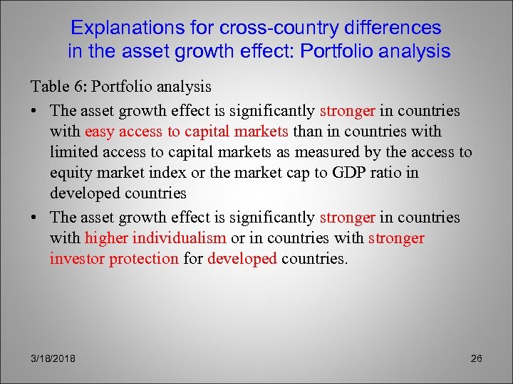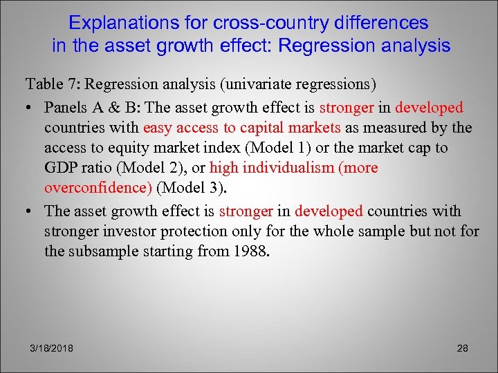 Explanations for cross-country differences in the asset growth effect: Regression analysis 3/18/2018 25