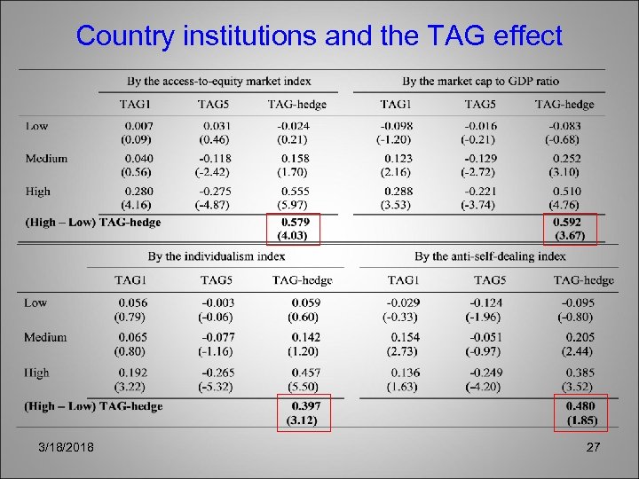 Explanations for cross-country differences in the asset growth effect: Portfolio analysis Table 6: Portfolio analysis • The asset growth effect is significantly stronger in countries with easy access to capital markets than in countries with limited access to capital markets as measured by the access to equity market index or the market cap to GDP ratio in developed countries • The asset growth effect is significantly stronger in countries with higher individualism or in countries with stronger investor protection for developed countries. 3/18/2018 26