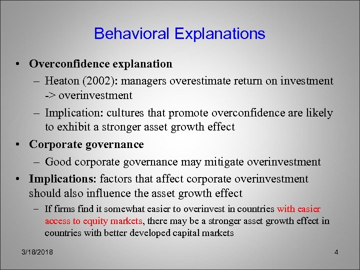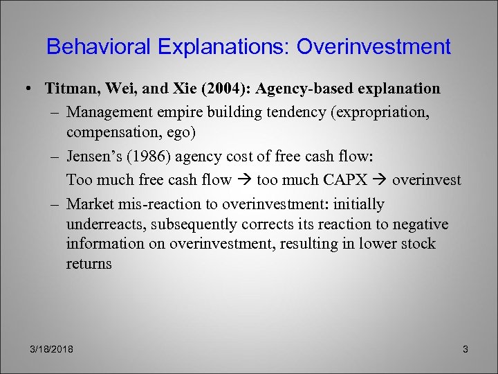 Behavioral Explanations: Overinvestment • Titman, Wei, and Xie (2004): Agency-based explanation – Management empire building tendency (expropriation, compensation, ego) – Jensen’s (1986) agency cost of free cash flow: Too much free cash flow too much CAPX overinvest – Market mis-reaction to overinvestment: initially underreacts, subsequently corrects its reaction to negative information on overinvestment, resulting in lower stock returns 3/18/2018 3
