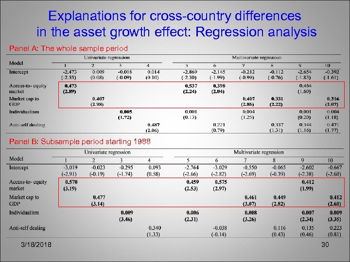 Explanations for cross-country differences in the asset growth effect: Regression analysis Panel A: The whole sample period Panel B: Subsample period starting 1988 3/18/2018 30