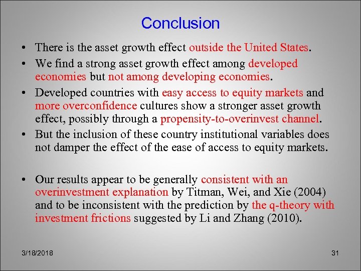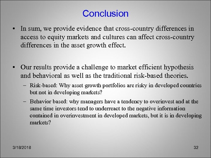 Conclusion • There is the asset growth effect outside the United States. • We find a strong asset growth effect among developed economies but not among developing economies. • Developed countries with easy access to equity markets and more overconfidence cultures show a stronger asset growth effect, possibly through a propensity-to-overinvest channel. • But the inclusion of these country institutional variables does not damper the effect of the ease of access to equity markets. • Our results appear to be generally consistent with an overinvestment explanation by Titman, Wei, and Xie (2004) and to be inconsistent with the prediction by the q-theory with investment frictions suggested by Li and Zhang (2010). 3/18/2018 31