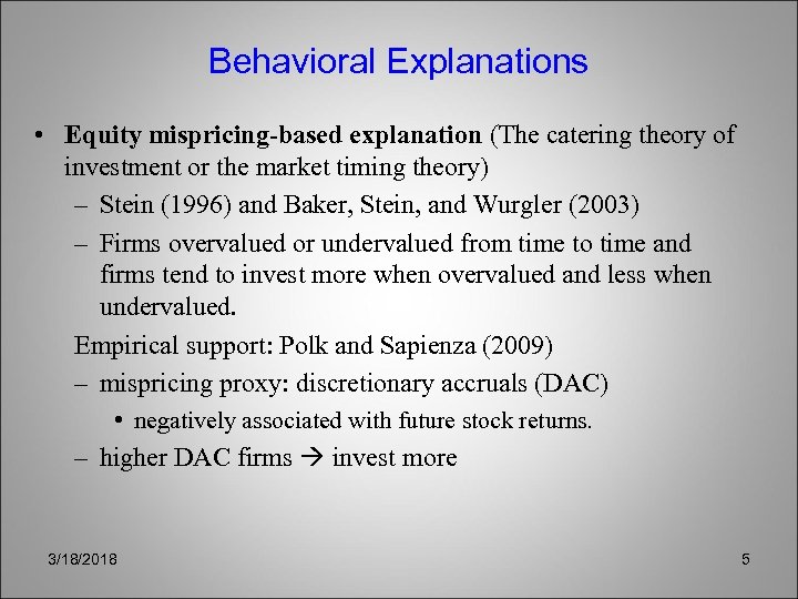 Behavioral Explanations • Equity mispricing-based explanation (The catering theory of investment or the market timing theory) – Stein (1996) and Baker, Stein, and Wurgler (2003) – Firms overvalued or undervalued from time to time and firms tend to invest more when overvalued and less when undervalued. Empirical support: Polk and Sapienza (2009) – mispricing proxy: discretionary accruals (DAC) • negatively associated with future stock returns. – higher DAC firms invest more 3/18/2018 5