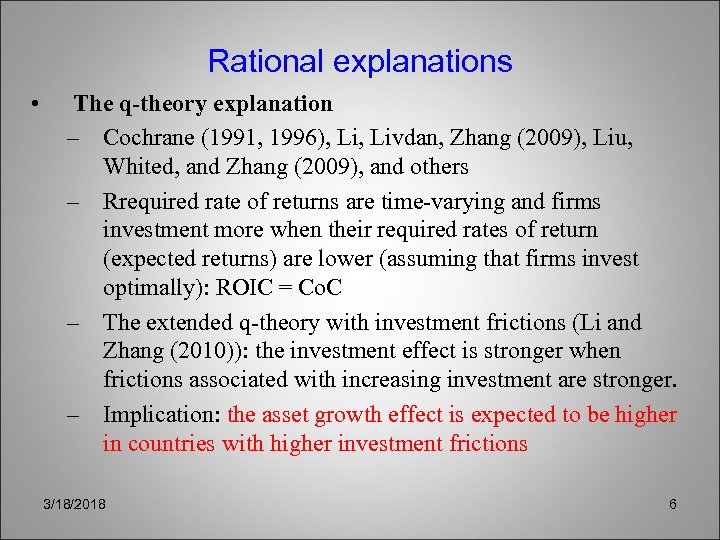 Rational explanations • The q-theory explanation – Cochrane (1991, 1996), Livdan, Zhang (2009), Liu, Whited, and Zhang (2009), and others – Rrequired rate of returns are time-varying and firms investment more when their required rates of return (expected returns) are lower (assuming that firms invest optimally): ROIC = Co. C – The extended q-theory with investment frictions (Li and Zhang (2010)): the investment effect is stronger when frictions associated with increasing investment are stronger. – Implication: the asset growth effect is expected to be higher in countries with higher investment frictions 3/18/2018 6