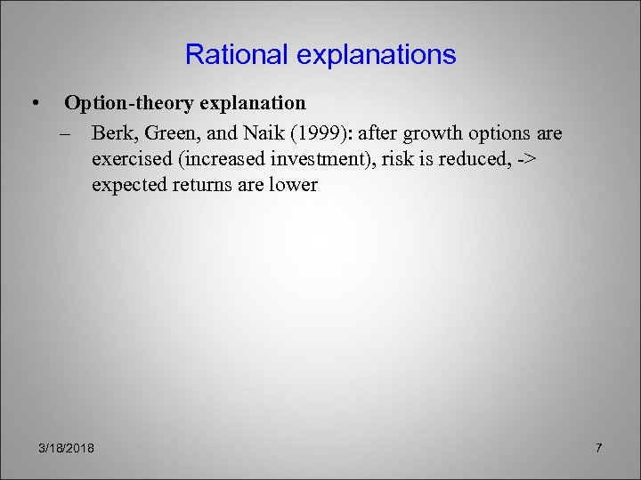 Rational explanations • Option-theory explanation – Berk, Green, and Naik (1999): after growth options are exercised (increased investment), risk is reduced, -> expected returns are lower 3/18/2018 7