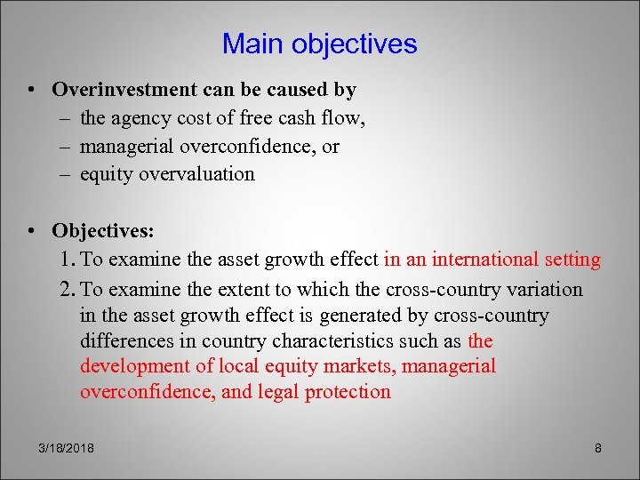 Main objectives • Overinvestment can be caused by – the agency cost of free cash flow, – managerial overconfidence, or – equity overvaluation • Objectives: 1. To examine the asset growth effect in an international setting 2. To examine the extent to which the cross-country variation in the asset growth effect is generated by cross-country differences in country characteristics such as the development of local equity markets, managerial overconfidence, and legal protection 3/18/2018 8