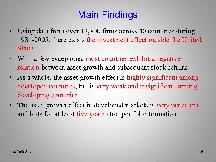 Main Findings • Using data from over 13, 300 firms across 40 countries during 1981 -2005, there exists the investment effect outside the United States • With a few exceptions, most countries exhibit a negative relation between asset growth and subsequent stock returns • As a whole, the asset growth effect is highly significant among developed countries, but is very weak and insignificant among developing countries • The asset growth effect in developed markets is very persistent and lasts for at least five years after portfolio formation 3/18/2018 9